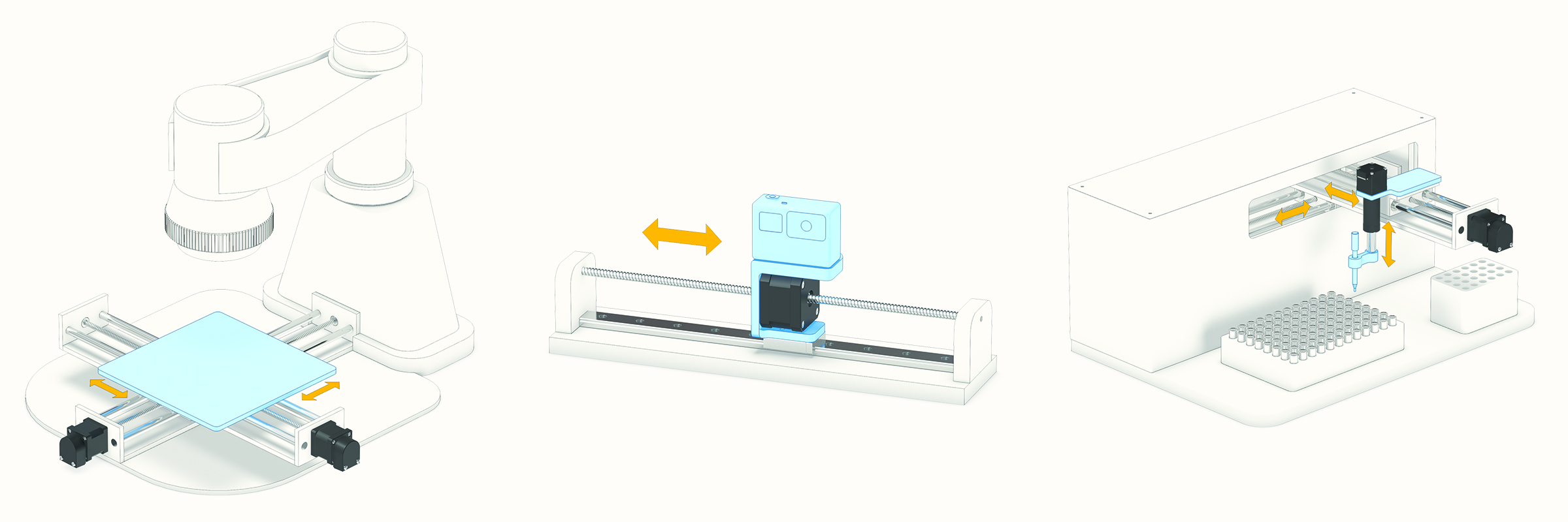 By reducing the total number of components needed, stepper motor linear actuators are ideal for reducing the size of the axis on a wide variety of space-conscious applications, including (left to right): XY stage (rotating screws), horizontal positioning (rotating nut), and fluid pipetting (telescoping and rotating screw).
